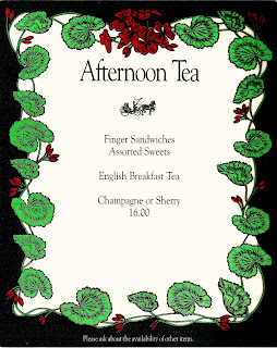 Notice the green and red geranium border around the menu. Carleton Varney was the Interior Designer for the Grand Hotel, and he used floral patterns with vibrant colors. The carpeting is a red geranium pattern.